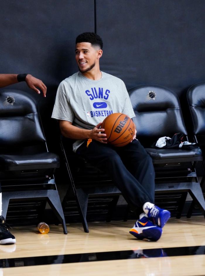 太阳官推晒出布克重返球队的照片,配文写道:你看谁在这儿啊。