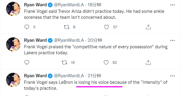 湖人队内训练充满竞争,詹姆斯不仅带队训练,而且把嗓子喊哑了;沃格尔透露由于队内训练强度很大,詹姆斯喊话喊到失声,这就是老詹的训练态度,为了让新队友融入湖人体系,真是太拼了。
