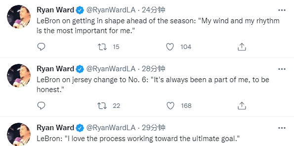 训练之后,詹姆斯接受采访,他表示纳恩、贝兹莫尔和小乔丹三大新援正在适应湖人的体系;谈到改穿湖人6号球衣,詹姆斯表示:说实话,这个号码始终是我的一部分;谈到休赛期保持体型,詹姆斯表示呼吸和节奏对自己是最重要的;老詹还表示:我喜欢朝着最终目标努力的过程。
