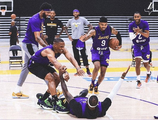 训练中詹姆斯躺在地板上,威少、浓眉、贝兹莫尔和艾灵顿都笑着冲过来去拉詹姆斯,安东尼则是站在场边,双手叉腰咧嘴大笑,如此一幕太暖心,这就是冲冠球队该有的氛围。