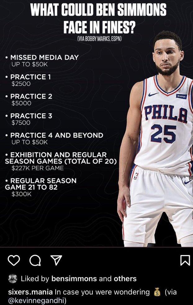 有趣的是,西蒙斯点赞了关于自己罚款详情的动态;此前西蒙斯已经表态,他根本不在乎被球队罚款,点赞举动再次表明了他的离队决心。