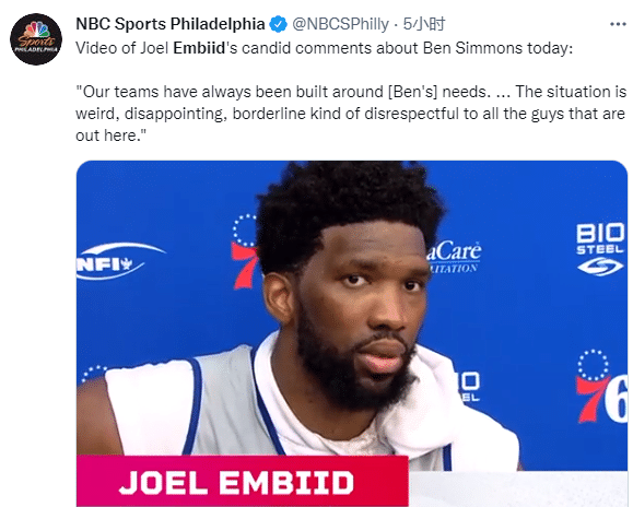 此前恩比德公开抱怨西蒙斯不尊重球队,还直言当初76人为了西蒙斯而放弃巴特勒是一个错误的决定,很明显76人双帝已经彻底决裂;上赛季76人第二轮被老鹰淘汰出局,西蒙斯因丧失进攻的信心和罚球糟糕被质疑,甚至被恩比德嘲讽以及得不到主帅的支持。