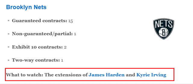 现在,篮网的训练营已经正式开始了,但两人都还没续约。根据劳资协议的规定,欧文可以在这个赛季的任何时间续约,但哈登的提前续约有时间限制,最晚是北京时间10月19日。在这一天前,哈登可以执行2022-23赛季的选项,再续签3年1.611亿美元的合同,这可以让他在布鲁克林一直留到2025-26赛季。欧文可以和篮网达成一份4年1.87亿美元的续约合同。