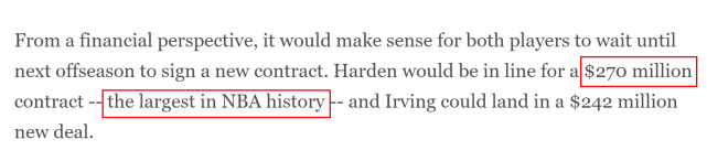 从经济角度出发,如果两名球员等到明年休赛期再续签一份新合同,都可以得到更多的钱。明年休赛期,哈登有资格签下一份2.7亿美元的合同,创造NBA历史纪录。欧文有资格签2.42亿美元。不过,多等一年,也存在伤病影响合同的风险。