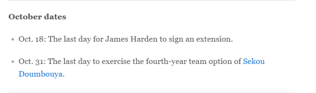 ESPN为篮网列出了两个需要关注的时间点。一个是哈登提前续约的截止日10月19日,另一个是11月1日(北京时间),是篮网决定是否执行敦布亚第四年球队选项的截止日。
