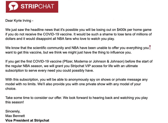 谁都知道欧文对于篮网的重要性,他是队内的三大巨头之一,而为了让欧文接种布鲁克林篮网所在的纽约,市长都呼吁欧文接种,为球迷而战。同时还有一家成人网站希望欧文可以改变自己的主意,甚至还给出了一些福利作为邀约。