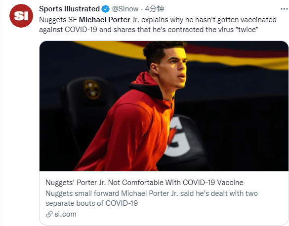 接受《丹佛邮报》采访时,掘金小前锋迈克尔·波特表示:我曾两次感染新冠病毒,我看到了我的身体如何反应,尽管接种疫苗的可能性很小,但你可能会对它产生不良反应,对我来说,我觉得很不舒服。