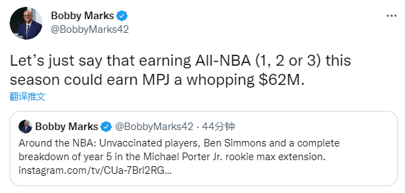 此前小波特才和掘金续签最高5年2.07亿美元的超级顶薪,只要在新赛季入选最佳阵容、最佳防守阵容、获得MVP或者获得DPOY,满足其一,他就能拿到2.07亿美元的顶薪,否则的话这合同就变成了5年1.45亿美元,也就相当于相差6200万美元;由于小波特拒绝接种疫苗,这不仅会影响他冲击2亿大合同,而且会影响掘金的一系列计划。