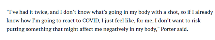小波特说:“我已经感染过两次了,我不知道注射后我的身体会发生什么,所以如果我已经知道我对新冠病毒的反应,我只是觉得,对我来说,我不想冒险把可能对我身体产生负面影响的东西注射到我的身体里。