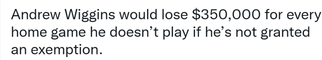 如果维金斯因此缺席主场比赛,他将损失不少钱。有记者提醒这一点时,维金斯的回答是:“这是我的问题,不是你的。”此前有报道称,维金斯每缺席一场主场比赛,将损失35万美元。