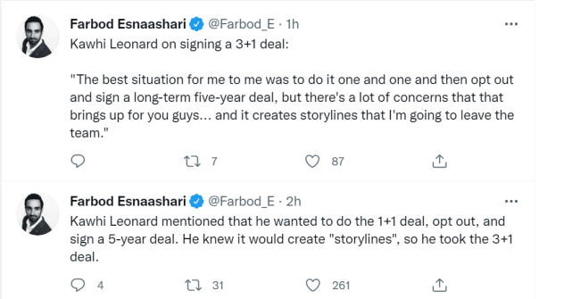 莱昂纳德和快船签下的是一份4年1.763亿美元的合同。他承认,对自己来说最好的选择是签一份1+1的合同,然后明年跳出合同,再签一份5年的长期合同。“不过,那会给你们(媒体)带来很多担忧,然后你们的工作就是创造我将离开这支球队的故事,”莱昂纳德说,“一方面原因是我想确保得到一些钱,另外,如果我今年能够回归赛场,我希望能回来。如果我签了1+1的合同,我很可能出于谨慎的考虑选择不打,然后跳出去签一份五年的合同。”