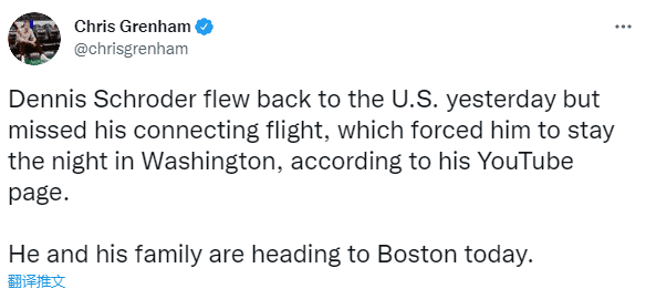 施罗德前往波士顿挺坎坷的,据NBA记者ChrisGrenham报道,凯尔特人后卫丹尼斯-施罗德昨天返回美国,但由于错过了转机航班,这迫使他在华盛顿滞留了一晚,对此有球迷调侃由于错过了高薪,施罗德暂时滞留在波士顿。