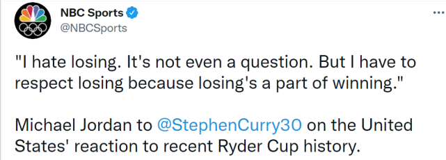 360直播9月27日讯 ,第43届莱德杯高尔夫球赛在美国呼啸峡球场落幕。美国队以19-9的总比分轻松战胜欧洲队,时隔五年夺回莱德杯。乔丹和库里,不同时代的两大巨星,都来到现场观战这次比赛,NBC体育晒出了两人的谈话内容。