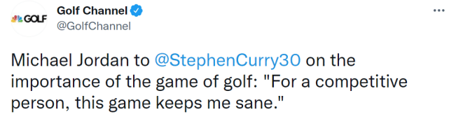 谈到高尔夫的重要性时,乔丹对库里说:“对于一个有斗志的人而言,这项运动能让我保持理智。”库里还询问乔丹,是否在莱德杯的美国队阵容中看到有人像自己。说到这儿,高情商的库里不忘补充一句:“或者说他们都没到你这个级别呢?”乔丹笑着提了几个选手的名字,在高尔夫球场上,乔丹也是不服老的。