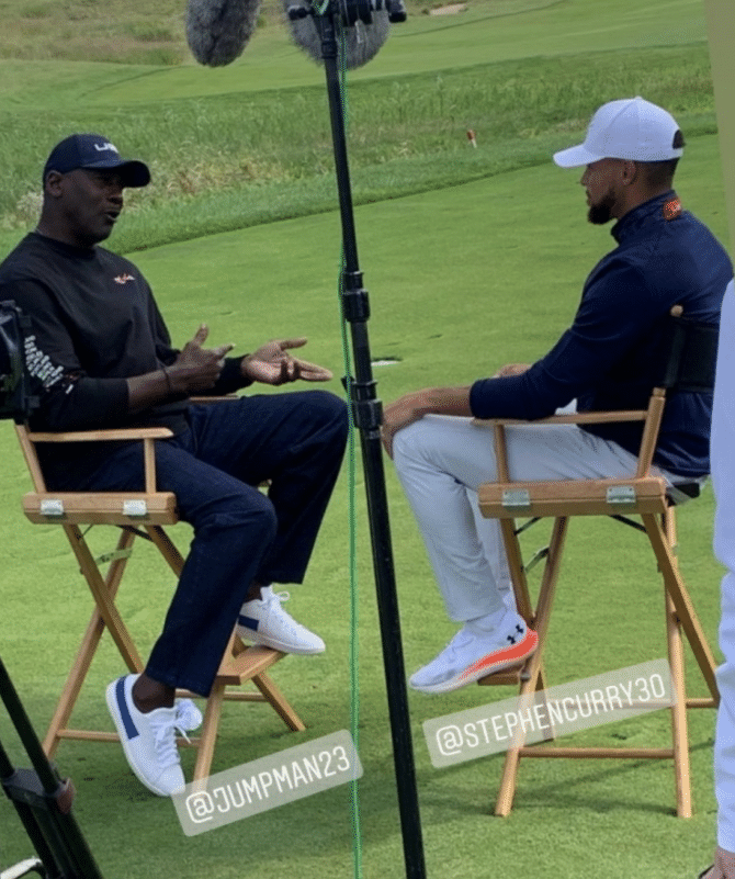 库里是当今NBA的超级球星,连续两份2亿+的合同,足以说明库里在这一个时代的江湖地位有多高,而且库里的媒体公司“全票”是莱德杯的合作伙伴,库里也在开幕时现身莱德杯,并且参与了高尔夫球赛事莱德杯的转播,期间乔丹的身影出现了,库里面对这突如其来的偶遇,果断追星乔丹,拉着乔丹坐下来闲聊一番,网友更是调侃“像极了小学生在听训话”。