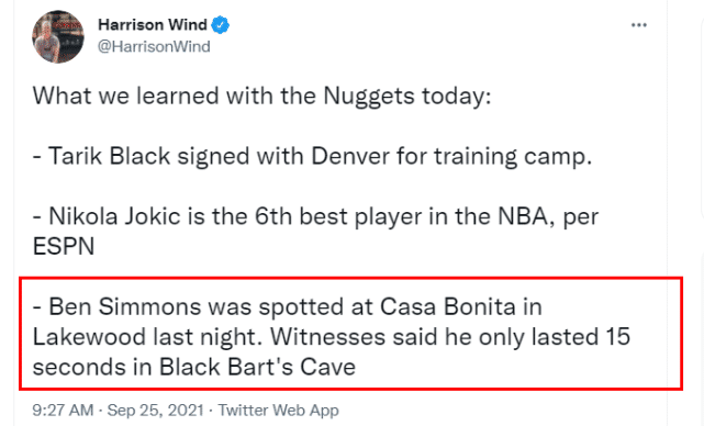 360直播9月25日讯 ,据掘金记者Harrion Wind报道,有人昨晚在丹佛的莱克伍德Casa Bonita餐厅偶遇本-西蒙斯,他短暂停留后离开。此前,美媒报道称掘金有兴趣得到西蒙斯,如今,西蒙斯现身丹佛引人遐想。