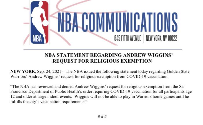 360直播9月25日讯NBA官方已经拒绝了维金斯以宗教为由拒绝接种疫苗的请求,旧金山当地规定12岁及以上的人必须接种疫苗才能进入大通中心球馆,NBA官方还在声明中提到:除非维金斯接种疫苗,否则他无法参加勇士主场的比赛。