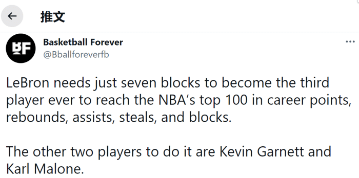 360直播9月24日讯 ,据美媒Basketball Forever报道,湖人球星勒布朗詹姆斯只差7次封盖,就可以成为NBA常规赛历史第三位在得分、篮板、助攻、抢断以及盖帽这5项主要数据全部位列历史前100的球员。目前历史上只有两名巨星做到这一点,分别是卡尔马龙和加内特。