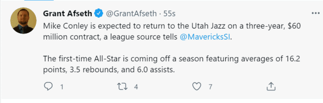 360直播讯北京时间8月1日,据NBA记者Grant Afseth报道,消息源透露,33岁的迈克-康利计划和爵士签下一份3年6000万美元的合同,此前,曾有记者爆料称康利可能签到一份3年7500万的合同,现在来看,他应该同意降薪留队了。