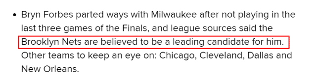 360直播讯北京时间8月1日,据B/R记者Jake Fischer报道,28岁的雄鹿射手布林-福布斯已经确定跳出合同,成为一名自由球员。联盟消息源透露,篮网目前领跑福布斯争夺战,另外,公牛、骑士、独行侠和鹈鹕也对他有意。