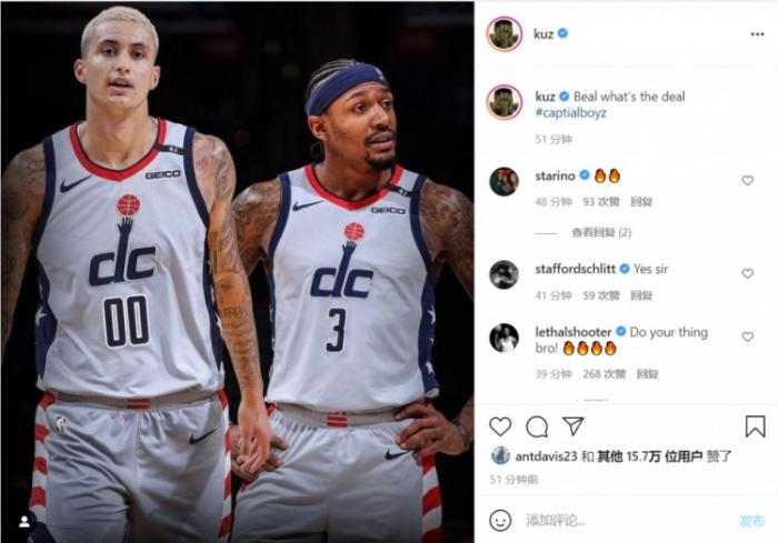 库兹马则是发长文感谢了湖人,表示“终生湖人”但现实还是要接受的,他对于前往奇才联手比尔也很开心,对于个人生涯来说去一个竞争力没那么强的球队可能更有利于发挥!今日他晒出了自己身穿奇才球衣和比尔的合成图问好“你好啊比尔”不过球迷提醒他别高兴太早,很可能他还会被交易。因为球队想用他和哈雷尔去换丁威迪!
