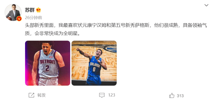 苏群在社媒发表看法“头部新秀里面,我最喜欢状元康宁汉姆和第五号新秀萨格斯,他们很成熟,具备领袖气质,会非常快成为全明星。 ”看来不仅这些新秀对自己有信心,外界也认为他们很快就能成就大业,那就期待新赛季的比赛吧!