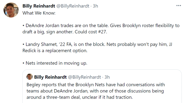 篮网记者Billy Reinhardt跟进报道了目前球队的运作。送走小乔丹,可以给篮网阵容腾出一个名额,他们可以通过选秀获得一个大个子,也可以签约一个内线。小乔丹的交易,可能会让篮网失去27号签。沙梅特也在交易谈判中,篮网大概率不会和他续约,雷迪克是替代选择。篮网有兴趣向上交易选秀权。