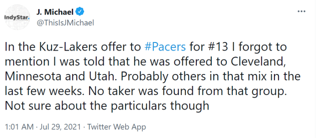 360直播讯 北京时间7月29日,据NBA记者J-迈克尔报道,湖人用库兹马向骑士、森林狼和爵士进行交易报价,但均遭到拒绝,而此前报道称,湖人用库兹马和22号签报价步行者的13号签,同样被拒绝。这样一来,至少四支球队拒绝了湖人关于库兹马的报价。