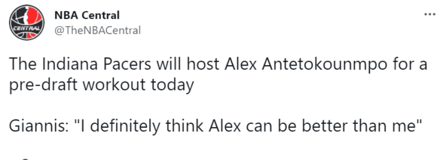 360直播讯 北京时间7月28日, 亚历克斯-阿德托昆博,字母哥的五弟完成了步行者的试训,将参加2021年NBA选秀。刚刚夺得总冠军和FMVP的字母哥,给了五弟很高的评价:“我绝对认为亚历克斯能比我更好。”