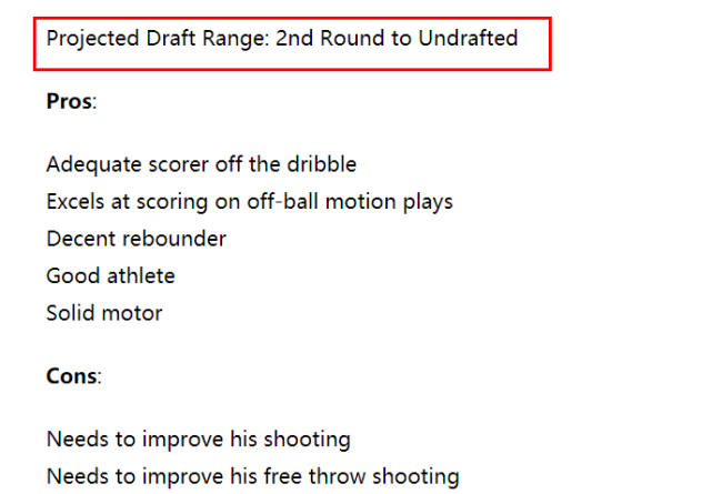 包括步行者在内,亚历克斯在选秀大会前一共试训了三支球队。NBA选秀网站上列出了亚历克斯的优缺点。他的优点是运动能力突出,身体条件比刚进入联盟时的字母哥更好,他是一个很有潜力的年轻人,防守犀利,有可能成长为精英级别的防守者,在小前锋位置上拥有很好的篮板能力,球场视野也不错,能打无球。