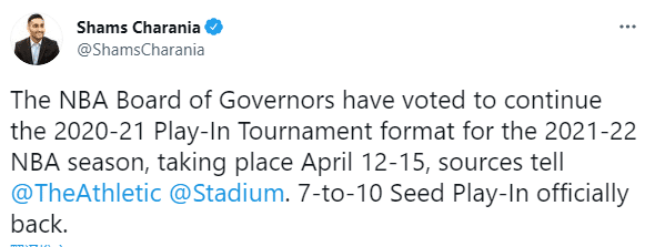 2021-2022赛季,NBA赛程恢复正常,并且保留了附加赛规则,NBA董事会成员已经正式投票并且通过这一决议。