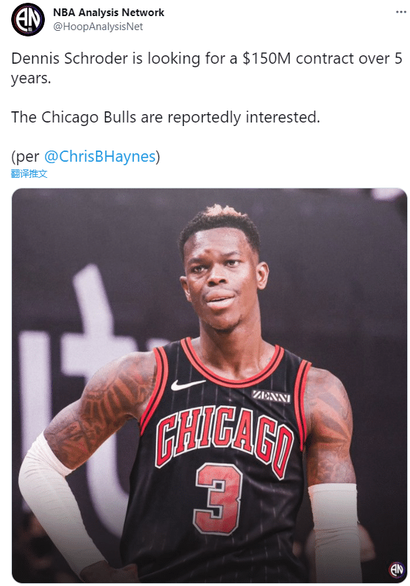 360直播讯北京时间7月27日,据名记ChrisHaynes的报道,湖人球员丹尼斯-施罗德正在寻找一份5年1.5亿美元的续约大合同,平均年薪高达3000万美元;名记还透露芝加哥公牛有意引援施罗德。