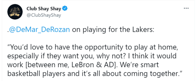 360直播讯 北京时间7月27日,即将成为自由球员的德罗赞,在一档节目中正式表态,愿意回到家乡洛杉矶打球,并相信自己和詹姆斯、浓眉能产生很好的化学反应,能够一起冲击总冠军。