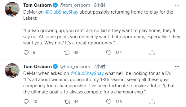 德罗赞则是明确表态愿意加盟湖人去冲击总冠军。