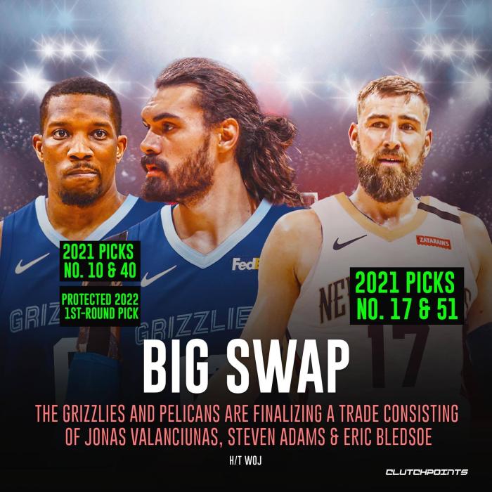 灰熊得到:2021年第10顺位以及第40顺位选秀权,2022年首轮选秀权(来自湖人,前十保护),亚当斯和布莱德索