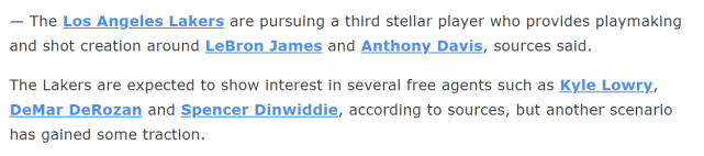 360直播讯 北京时间7月26日,名记查拉尼亚和沃纳罗斯基都报道了湖人的最新运作。这支在本赛季首轮就被淘汰的劲旅,正试图在休赛期补强阵容,力争在2021-22赛季重夺总冠军。