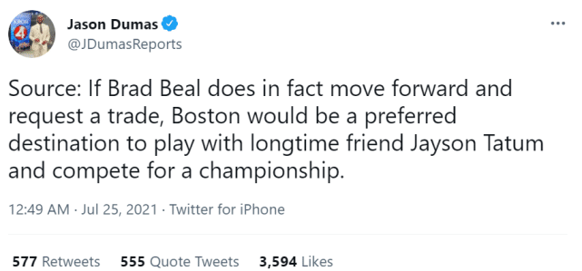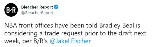360直播讯 北京时间7月25日,据Bleacher Report(B/R)记者Jake Fischer报道,奇才球星布拉德利-比尔考虑在选秀大会前申请交易,而B/R的另一位记者Jason Dumas爆料称,如果比尔决定申请交易,他的首选下家将是凯尔特人。