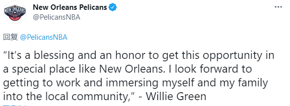 上赛季鹈鹕再次无缘季后赛,大范甘迪仅仅执教一年便被解雇,很大的原因是鹈鹕球员对大范很不满;如今鹈鹕新帅正式上任,威利-格林表示能在新奥尔良这样一个特殊地方得到这个机会是一种荣誉。我期待着去工作,让自己和家人融入当地社区。
