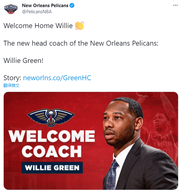 360直播讯 北京时间7月23日,新奥尔良鹈鹕正式官宣新教练,晒照并且发推写道:欢迎威利回家,鹈鹕队新主帅,威利-格林!