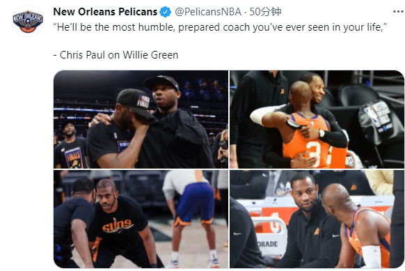 此前保罗曾盛赞威利-格林:他将是你一生中见过的最谦虚、最有准备的教练;鹈鹕官方晒出威利-格林和保罗的多张同框合影。