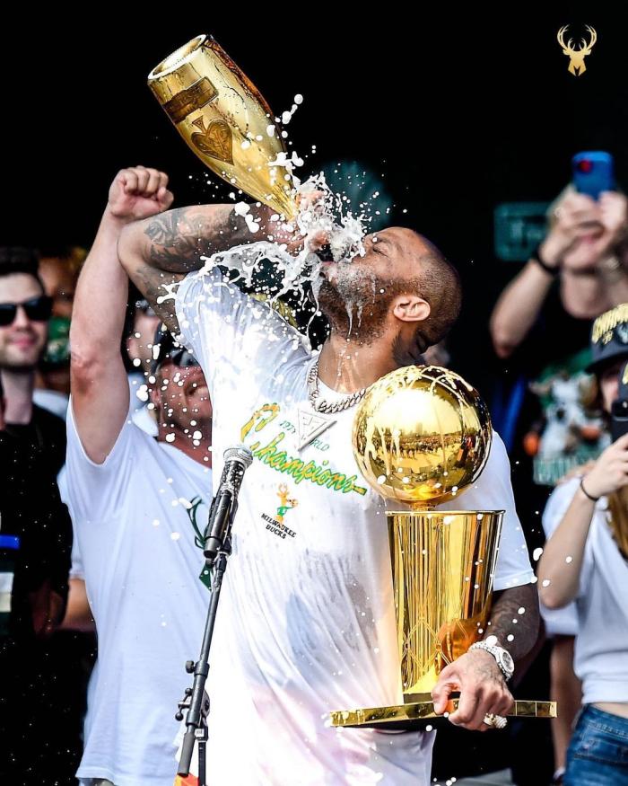 在夺冠庆典大舞台上,塔克拎着一瓶香槟走到话筒前,之后字母哥亲自把总冠军奖杯递给塔克,塔克抱着奥布莱恩杯又是一顿狂吻;紧接着塔克狂喝香槟,然后喷出来,雄鹿球迷再次欢呼,然后塔克开心地走开。