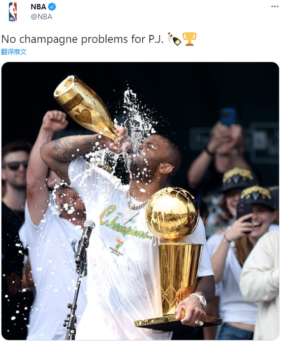 NBA官方晒出塔克狂喝香槟的豪放一幕,发推:塔克根本不用担心香槟的问题。