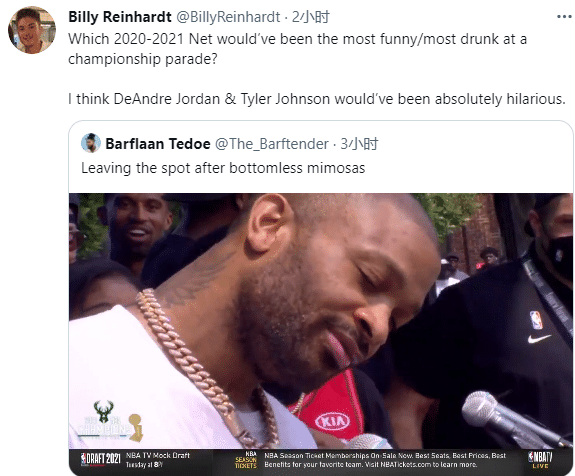 离开舞台时,塔克的表情就像喝醉了似的,满脸醉意却写满了幸福;对此篮网记者Bill Reinhardt发推:在夺冠庆典上,哪一个篮网球员会喝醉大醉?很明显是小乔丹和泰勒-约翰逊。