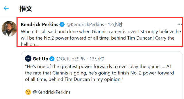 在今天的ESPN节目中,评论员帕金斯表示:按字母哥现在的成长速度,在他职业生涯结束时,他将成为有史以来排名第二的大前锋,仅次于蒂姆邓肯。
