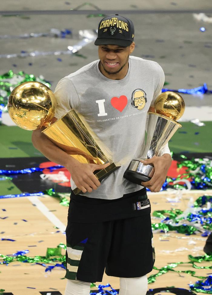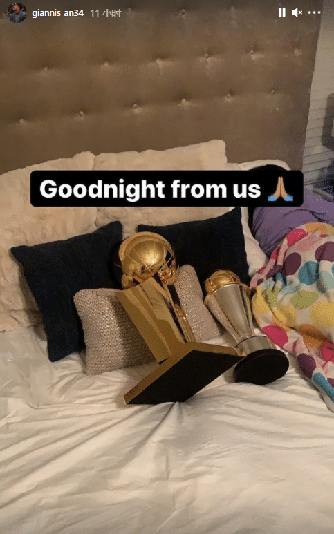 360直播讯 密尔沃基雄鹿4-2击败太阳夺得总冠军之后,字母哥第一个把总冠军奖杯带回家,并且抱着奥布莱恩杯和FMVP奖杯睡觉;总决赛G6字母哥狂砍50分14篮板5盖帽,总决赛场均35+13全票当选FMVP。