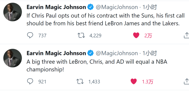 在太阳输给雄鹿后,湖人名宿魔术师约翰逊就第一时间发推表示:如果保罗休赛期跳出合同,他的第一个电话应该是来自他最好的朋友詹姆斯和湖人队。若是保罗和詹姆斯、浓眉哥组成三巨头,这等同于NBA总冠军!