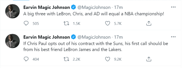 约翰逊在社媒上写道:“如果克里斯-保罗跳出他和太阳的合同,他接到的第一个电话应该是来自他最好的朋友勒布朗-詹姆斯和湖人。由勒布朗、克里斯和AD组成的三巨头,将肯定能拿下一座NBA总冠军!”