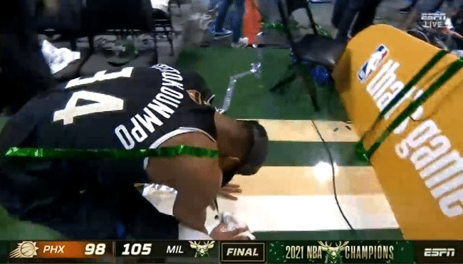 比赛终场哨音响起之后,字母哥先是和妻子拥抱,随后和家人拥抱,然后戴上了工作人员递上的冠军帽,随后情绪难耐激动,喜极而泣