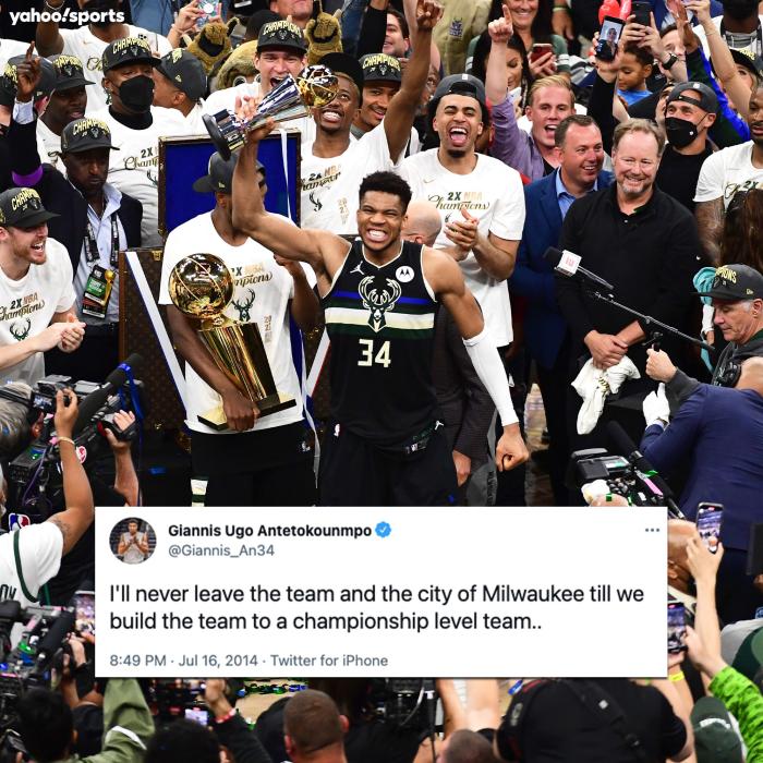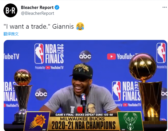 当然这只是一句玩笑话而已;不过字母哥7年前的推文被挖出,在夺冠之前,我绝不会离开雄鹿,离开密尔沃基这座城市;对此美媒调侃字母哥的任务已经完成了。