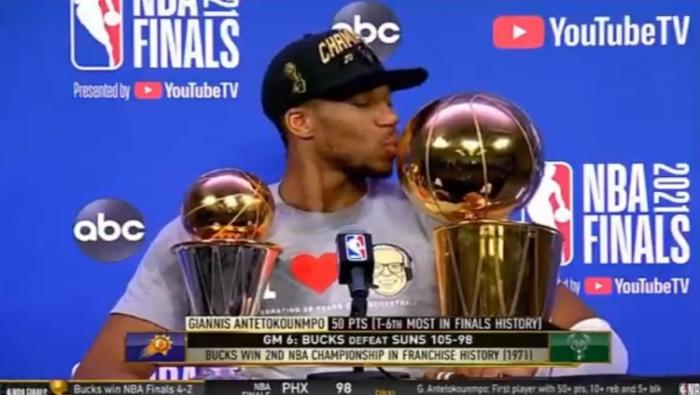字母哥还在发布会现场亲吻总冠军奖杯,然后告诉FMVP奖杯不要嫉妒。